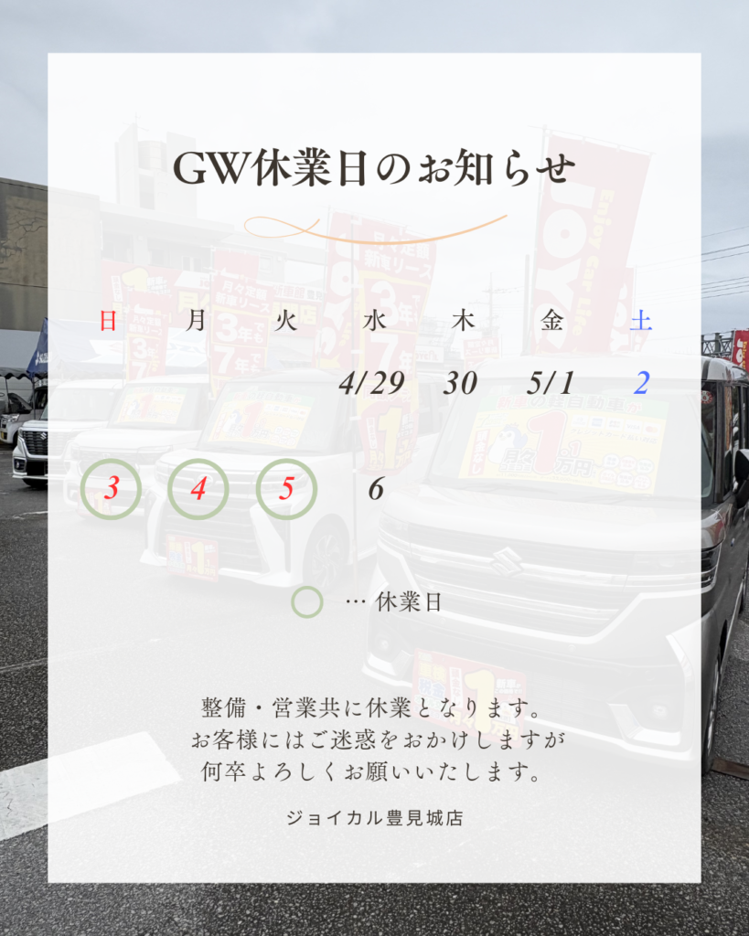 誠に勝手ながら5/3(日)~5/5(火)の3日間を営業・整備部門共にGW休業とさせていただきます。